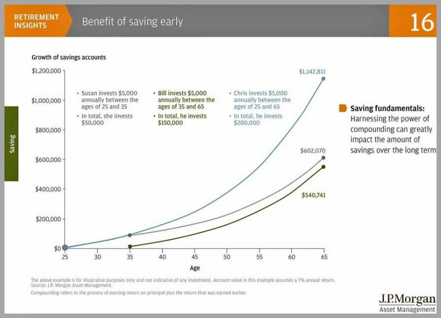 So Michael started the earliest by saving $120,000 from age 25 to 35 and starting age 35, invested that $120,000. Then left the balance of $120,000 to accrue at 7% annual return until age 65 when he retired.